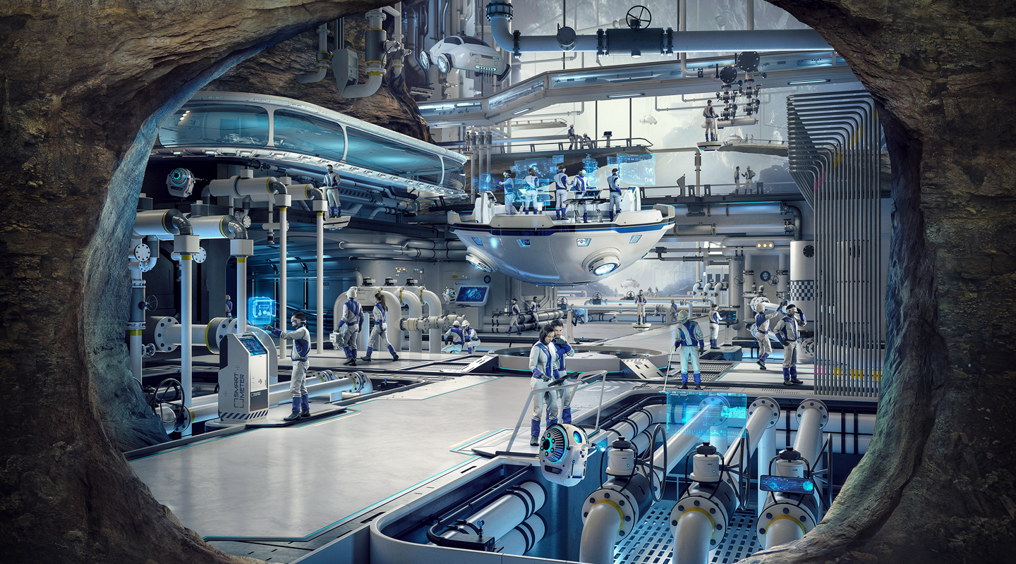 The "underground world" of Italgas is represented in a futuristic way and talks about the digitalization of the net, of flying machines but with the human faces of technicians at work: everyday life today and tomorrow that mix together.