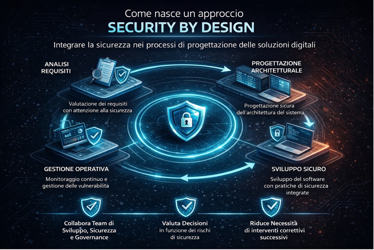 La sicurezza viene introdotta già nella fase di analisi dei requisiti, prosegue nella progettazione architetturale e continua nello sviluppo e nella gestione operativa. In pratica, ogni decisione progettuale – dalla scelta delle tecnologie alla gestione dei dati – viene valutata anche in funzione dei rischi di sicurezza.